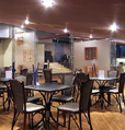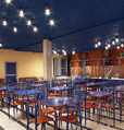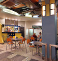 Интересные формы потолка и стен, изящные столики с низкими "пухлыми" диванчиками, сине-оранжевые стекла - сразу видно,